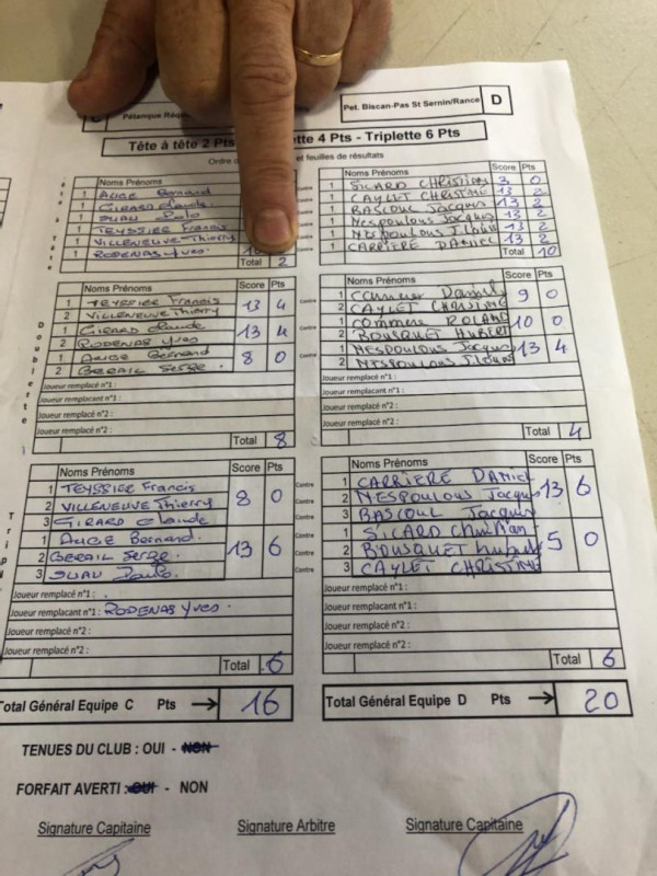 5° journée: Pour cette 5° journée, vu qu'ils sont résistants, le "Plan Canicule" a été lévé et les rencontres se déroulaient de nouveau l'aprem. Réquista se déplacait ce Jeudi 23 Juin à Broquies pour jouer contre TOURNEMIRE. défaite de REQUISTA 8 à 28 ( ? Tête, ? Double, ? Triple). La derniere journée sera determinante pour jouer les phases finales. En effet, 4 équipes dans un mouchoir de poche pour jouer la 2° place qui est qualificative pour les phases finales en Septembre . Composition de l'équipe: Serge BERAIL (cap), Claude GIRARD, Françis TEYSSIER, Thierry VILLENEUVE, Jean-Luc JOVER, RODENAS Yves, Polo SUAU, Jean-Claude CRAYON.