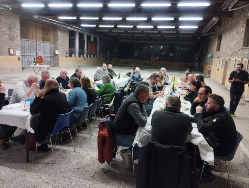 Après l'apéro pris au chaud dans le boulodrome, la 40aine de participants sont passés à table pour manger une salade, déguster un savoureux sauté de porc à la bière, suivi de Roquefort (of course) et terminer par de délicieuses bûches au chocolat et ou de la galette pour les non adeptes du chocolat.