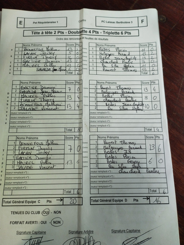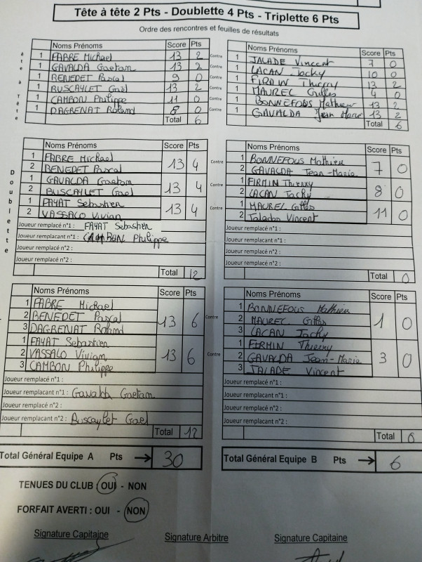 1° journée : défaite contre Cassagnes 16 à 20 (4 têtes, 2 doubles, 0 triple) : on est nullll !!!!